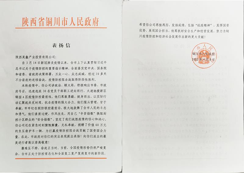4月上旬,銅川市人民政府向陜西美鑫公司發來一封《表揚信》,對該公司積極參與銅川市3.14疫情防控工作付出的努力和做出的貢獻表示高度的贊揚,對主動擔當、勇于作為,防疫情、穩生產取得的成績給予充分肯定。
