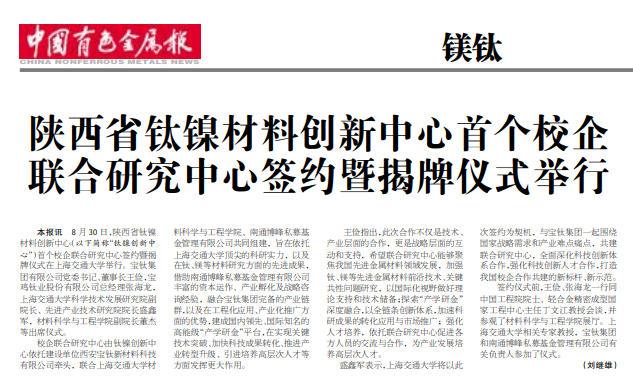 8月30日,陜西省鈦鎳材料創新中心(以下簡稱“鈦鎳創新中心”)首個校企聯合研究中心簽約暨揭牌儀式在上海交通大學舉行。寶鈦集團有限公司黨委書記、董事長王儉,寶雞鈦業股份有限公司總經理張海龍,上海交通大學科學技術發展研究院副院長、先進產業技術研究院院長盛鑫軍,材料科學與工程學院副院長董杰等出席儀式