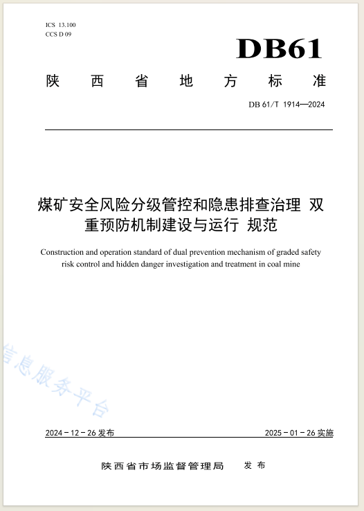 近日,陜西省發(fā)布《煤礦安全風(fēng)險(xiǎn)分級(jí)管控和隱患排查治理雙重預(yù)防機(jī)制建設(shè)與運(yùn)行規(guī)范》(DB61/T 1914-2024),并于2025年1月26日正式實(shí)施,由陜西省應(yīng)急管理廳、中國(guó)礦業(yè)大學(xué)安全科學(xué)與應(yīng)急管理研究院、陜西有色金屬控股集團(tuán)有限責(zé)任公司等單位共同起草完成。