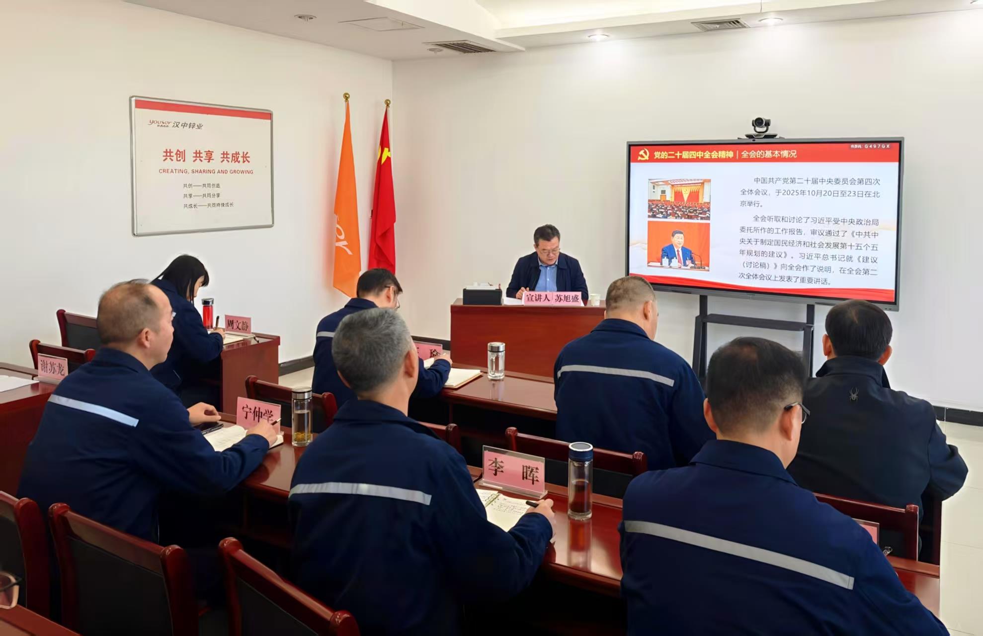 蘇旭盛強調,學習宣傳貫徹全會精神,是當前和今后一個時期的重大政治任務,要準確把握全會精神的核心要義,深刻認識“十五五”時期經濟社會發展的重大意義,全面對標黨中央部署要求,扎實推進全會精神的學習貫徹、“十五五”規劃編制和當前各項重點工作。蘇旭盛要求,一要把學習黨的二十屆四中全會精神轉化為推動各項工作的強大動力,切實推動漢中鋅業高質量發展;二要抓實年末歲尾安全生產,確保全面完成年度目標任務;三要科學謀劃“十五五”規劃與2026年工作,扎實推進重點工作落地見效。